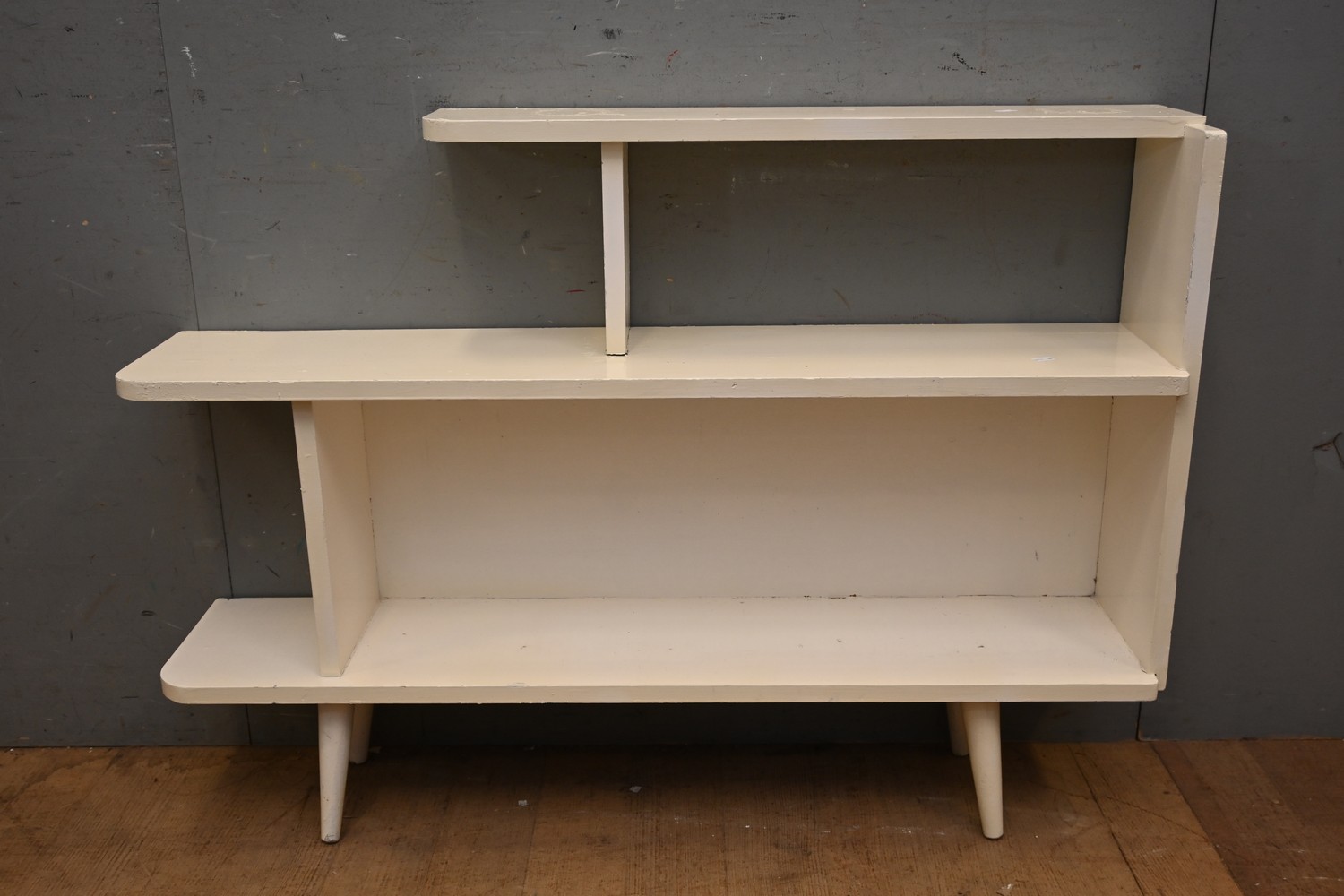 AUSTRALIAN MADE PAINTED WHITE OAK ART DECO THREE TIER WATERFALL BOOKSHELF (A/F) (77H X 106W X 22D CM) (LEONARD JOEL DELIVERY SIZE: LARGE)