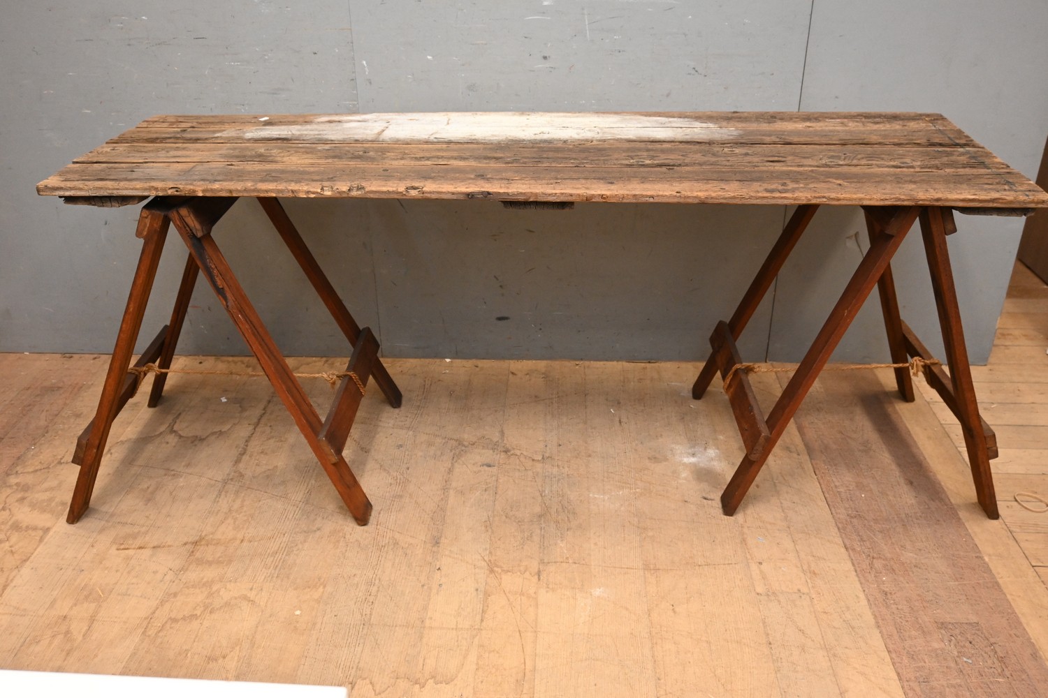 AN ANTIQUE PINE TRESTLE TABLE (74H X 187W X 58D CM) (LEONARD JOEL DELIVERY SIZE: LARGE)
