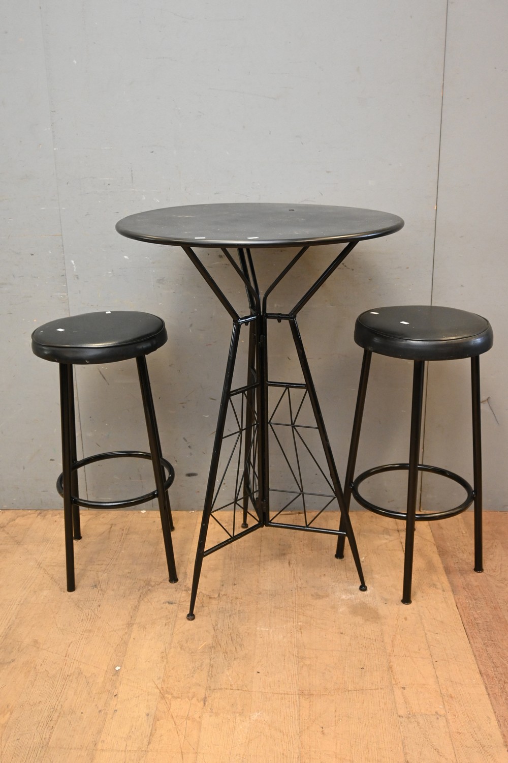AUSTRALIAN MADE THREE PIECE PAINTED BLACK METAL FRAMED BAR TABLE AND TWO CHAIRS (A/F) (102H X 70D CM) (LEONARD JOEL DELIVERY SIZE: LARGE)