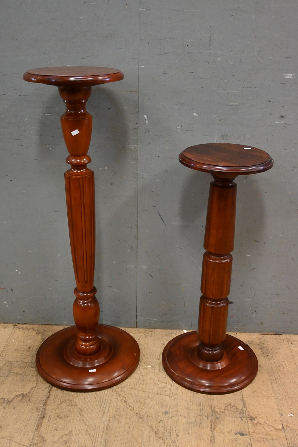 TWO AUSTRALIAN MADE SOLID MAHOGANY TURNED PEDESTALS – ORIGINAL MAKERS STAMPS TO THE BOTTOM OF BOTH (101H X 38 DIAMETER CM) (LEONARD JOEL DELIVERY SIZE: LARGE)