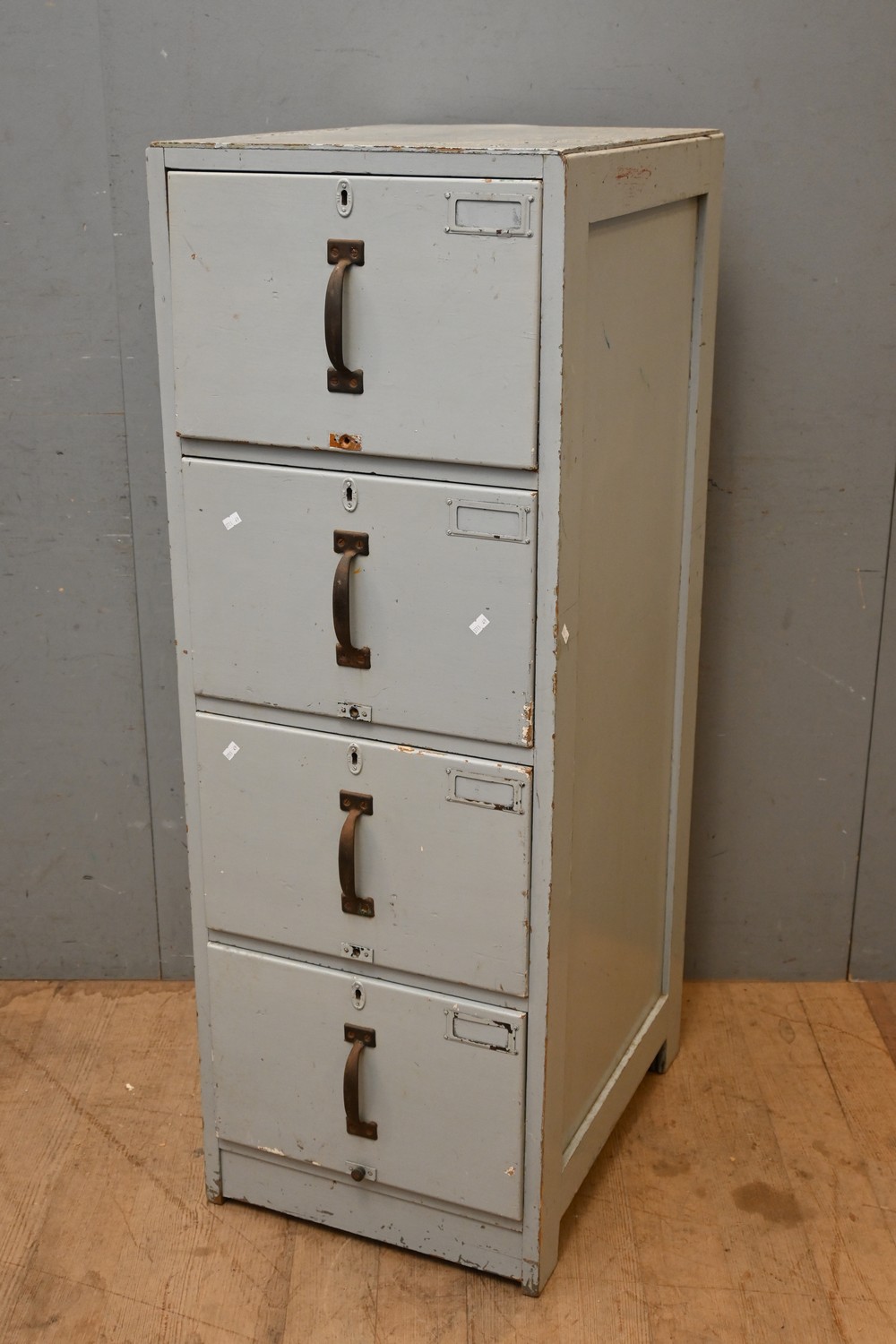AN AUSTRALIAN MADE INDUSTRIAL SOLID WOODEN FOUR DRAW UPRIGHT FILING CABINET (A/F) (182H 46W 59D CM)