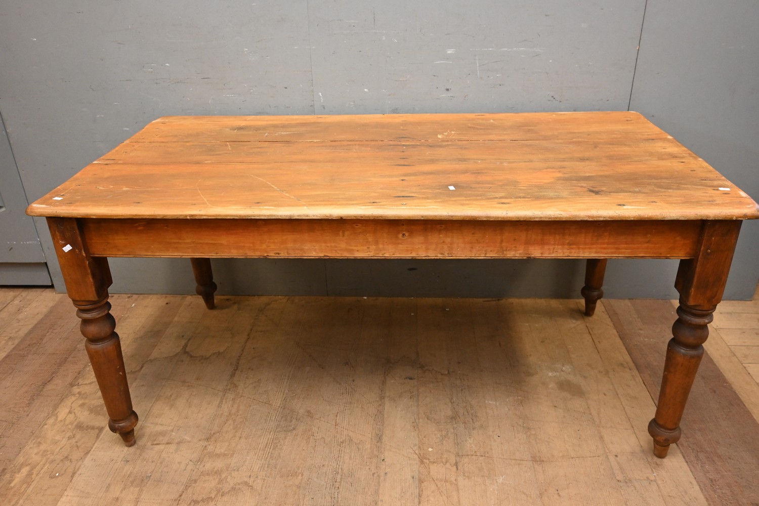 19TH CENTURY AUSTRALIAN SOLID PINE FARMHOUSE TABLE WITH TURNED LEGS (A/F) (79H X 168W X 87D CM) (PLEASE NOTE THIS HEAVY ITEM MUST BE REMOVED BY CARRIERS AT THE CUSTOMER'S EXPENSE. LEONARD JOEL STAFF CANNOT ASSIST CARRYING THIS ITEM) (X-LARGE ITEM)