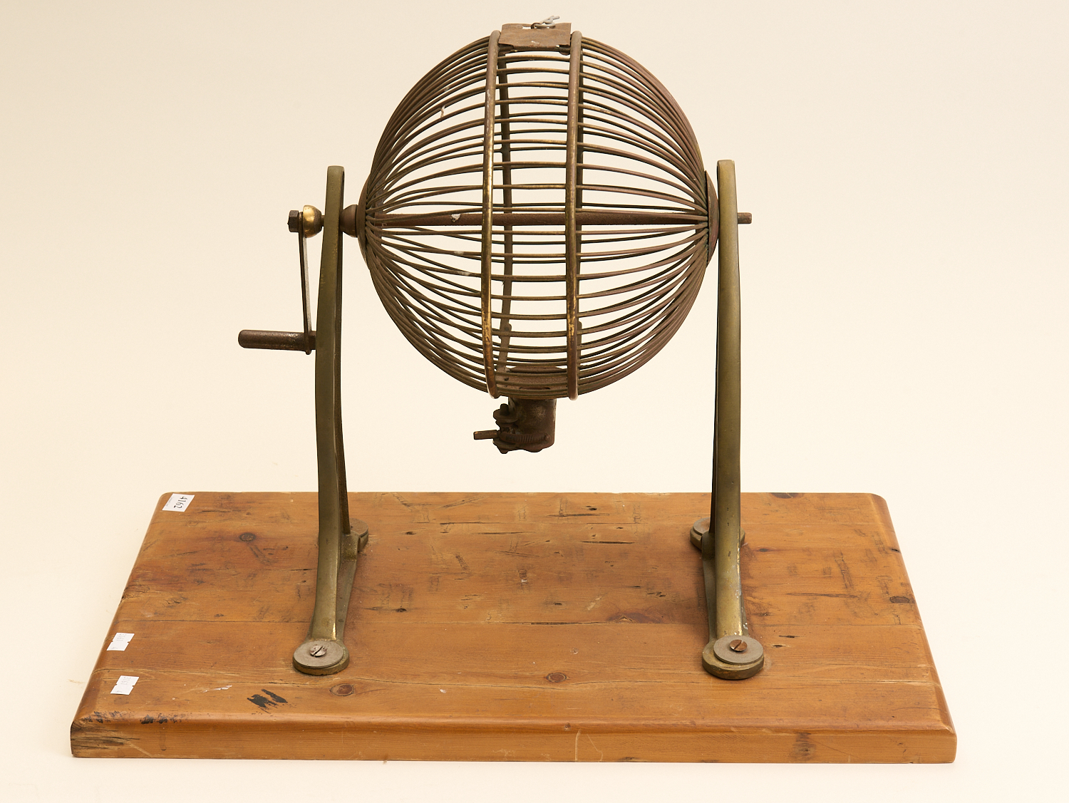 A BRASS LOTTO BARREL ON WOODEN BASE (A/F) H. 41CM X W.55CM, LEONARD JOEL LOCAL DELIVERY SIZE: MEDIUM