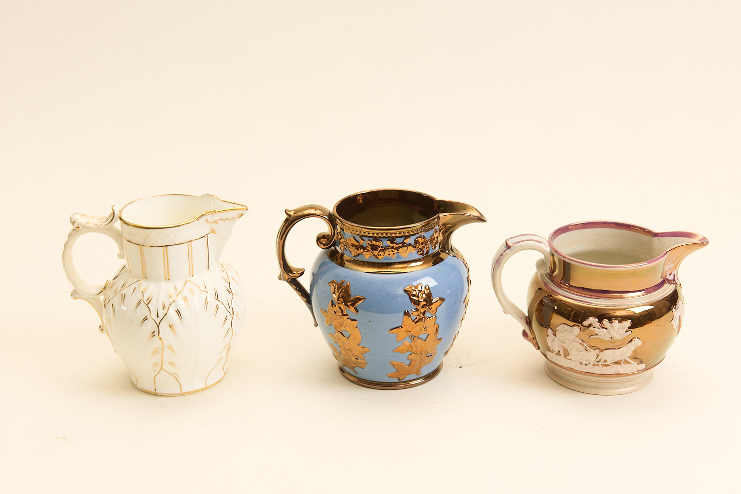 THREE ENGLISH JUGS INCLUDING TWO WITH LUSTRE GLAZE H.14CM (TALLEST), LEONARD JOEL LOCAL DELIVERY SIZE: MEDIUM