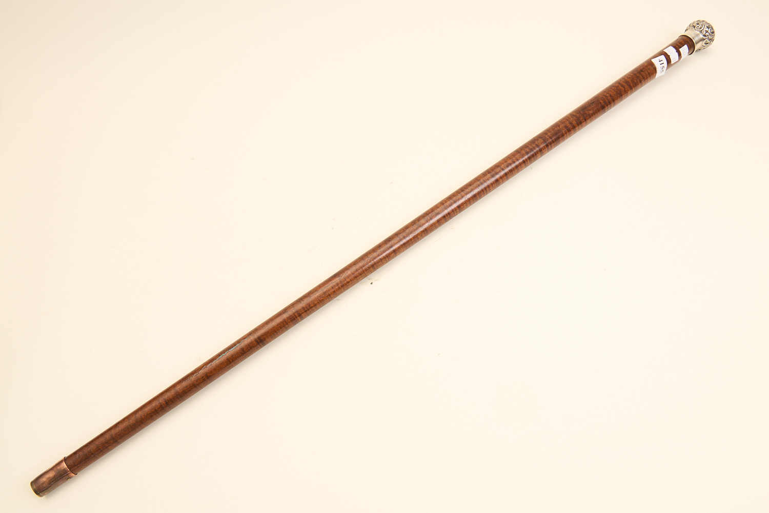 A 20TH CENTURY STERLING SILVER AND FIDDLEBACK BLACKWOOD WALKING STICK H.90CM, LEONARD JOEL LOCAL DELIVERY SIZE: SMALL