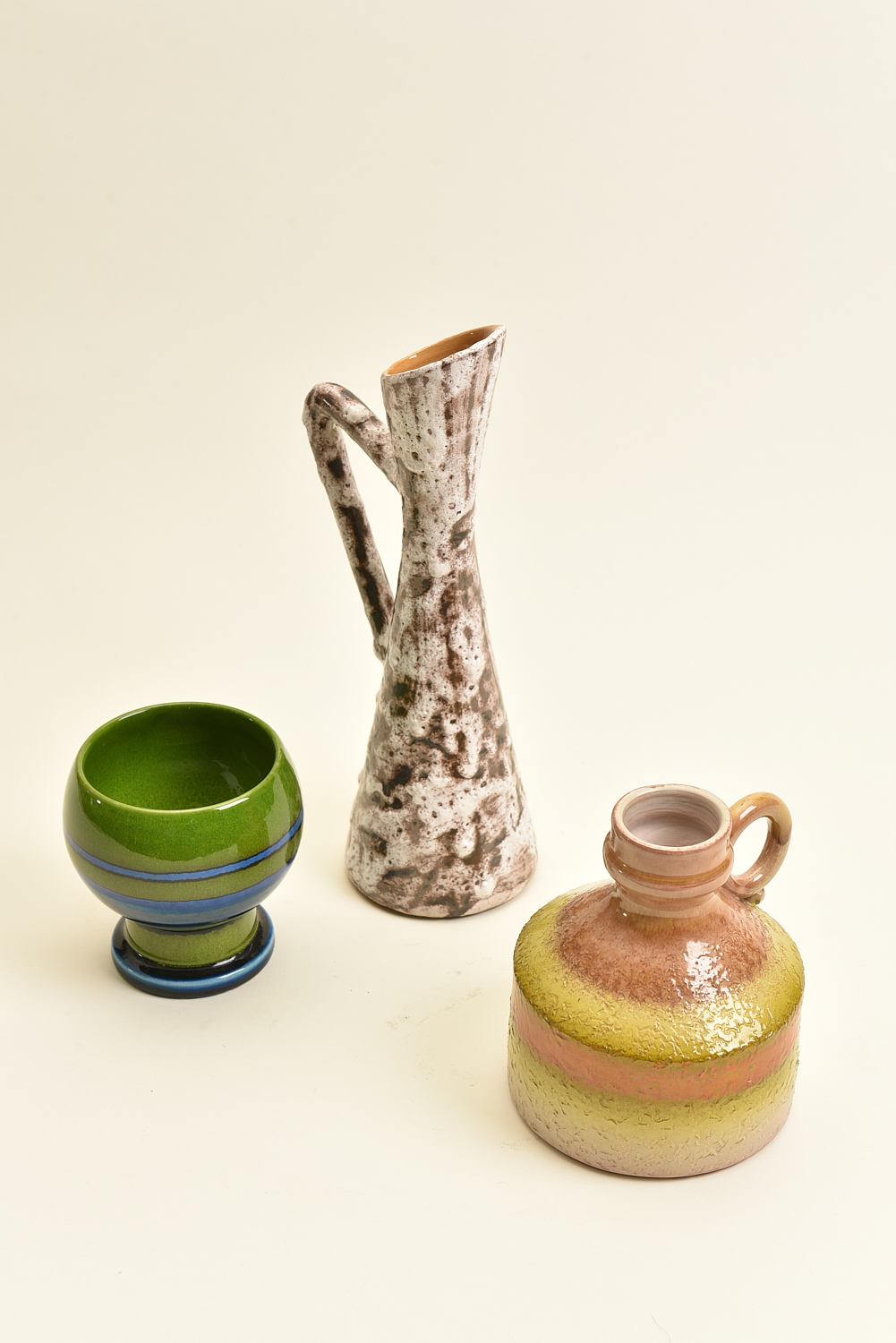THREE MID CENTURY POTTERY ITEMS INCLUDING VASES AND JUG H.28CM (TALLEST), LEONARD JOEL LOCAL DELIVERY SIZE: MEDIUM