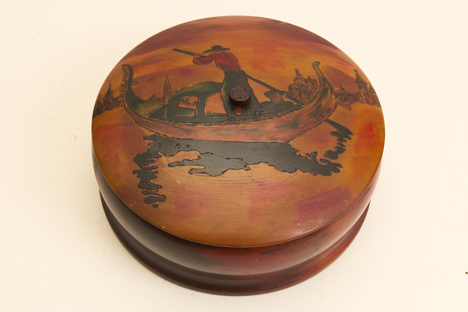A POKER WORK BOX RETAILED BY J.A.ROBERTS BRIDGE STREET BENDIGO (A/F) DIA.23.5CM, LEONARD JOEL LOCAL DELIVERY SIZE: MEDIUM