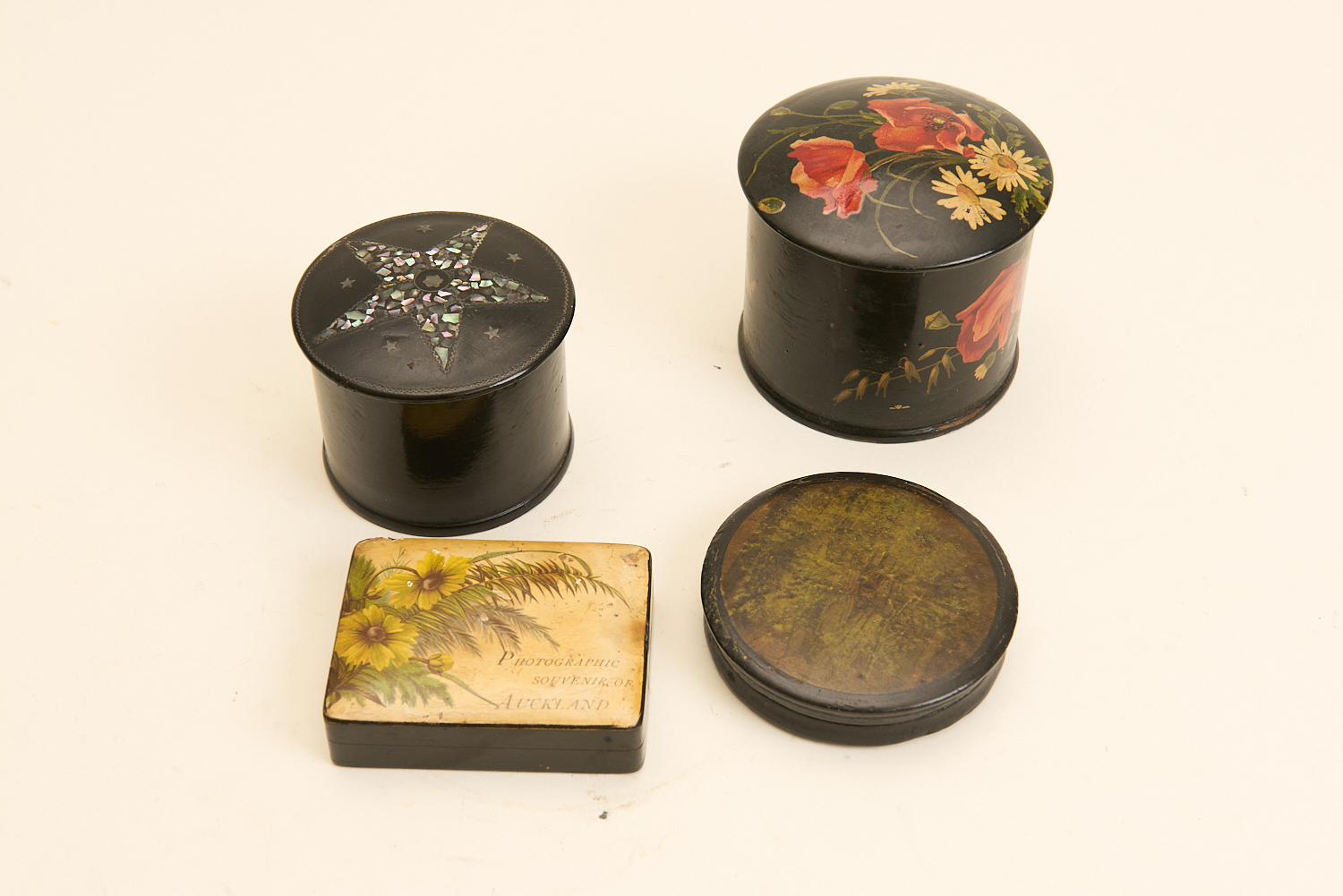 A COLLECTION OF FOUR 19TH AND 20TH CENTURY LACQUER BOXES INCLUDING PATCH AND SNUFF BOX H.8CM X DIA.10CM (LARGEST), LEONARD JOEL LOCAL DELIVERY SIZE: SMALL