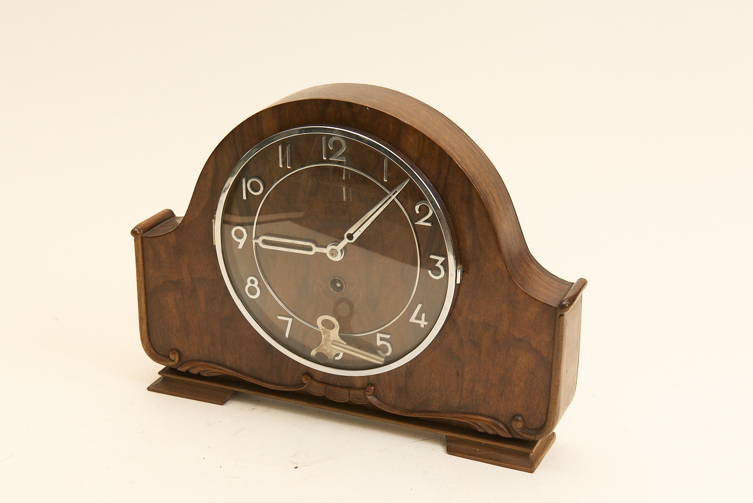 A WALNUT MANTLE CLOCK WITH CHROMED DIAL AND NUMBERS W.30CM, LEONARD JOEL LOCAL DELIVERY SIZE: SMALL