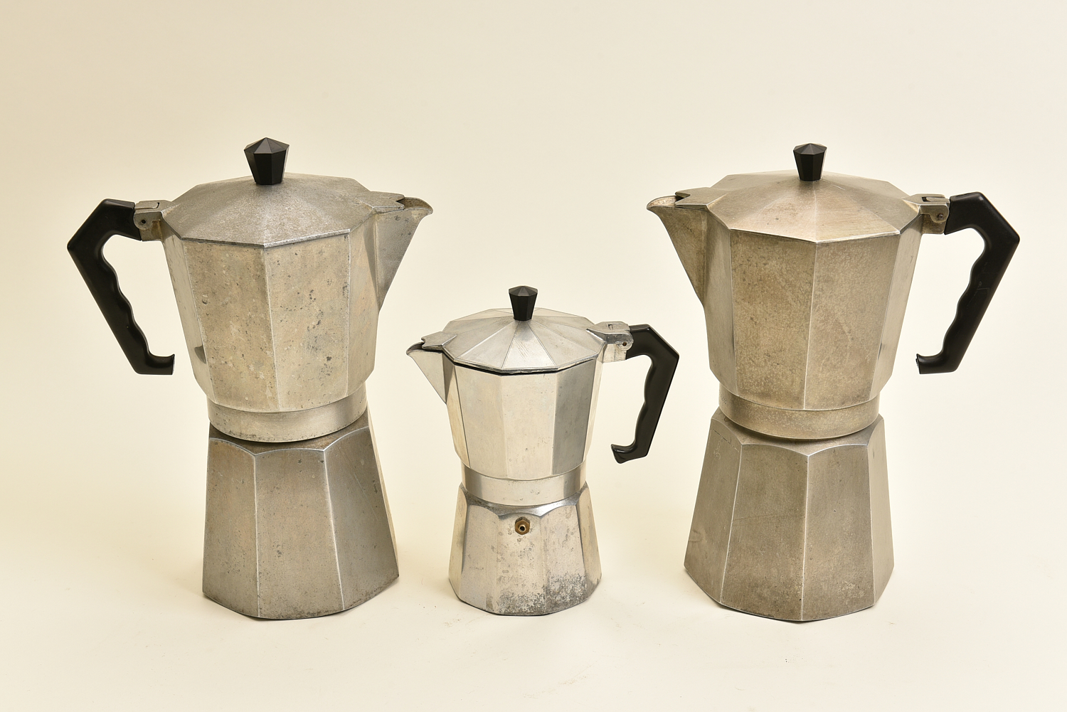 THREE VINTAGE ITALIAN METAL COFFEE PERCOLATORS, LEONARD JOEL LOCAL DELIVERY SIZE: MEDIUM