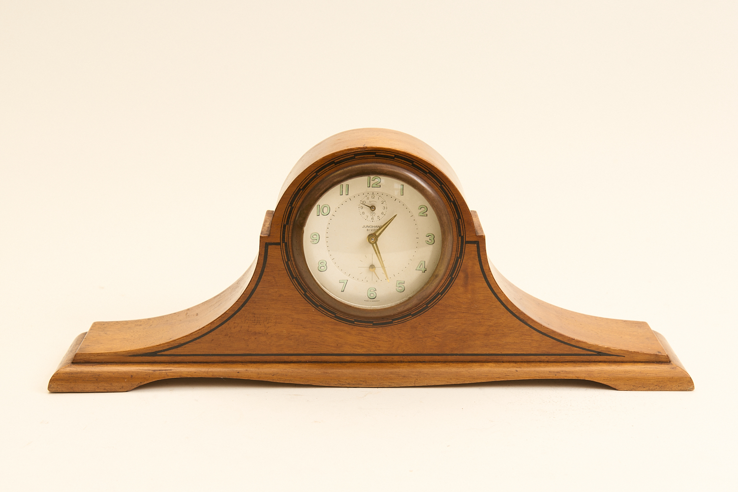AN ART DECO WOODEN CASED MANTLE CLOCK BY JUNGHANS OF GERMANY WITH INLAID EBONY DETAIL W.40CM, LEONARD JOEL LOCAL DELIVERY SIZE: SMALL