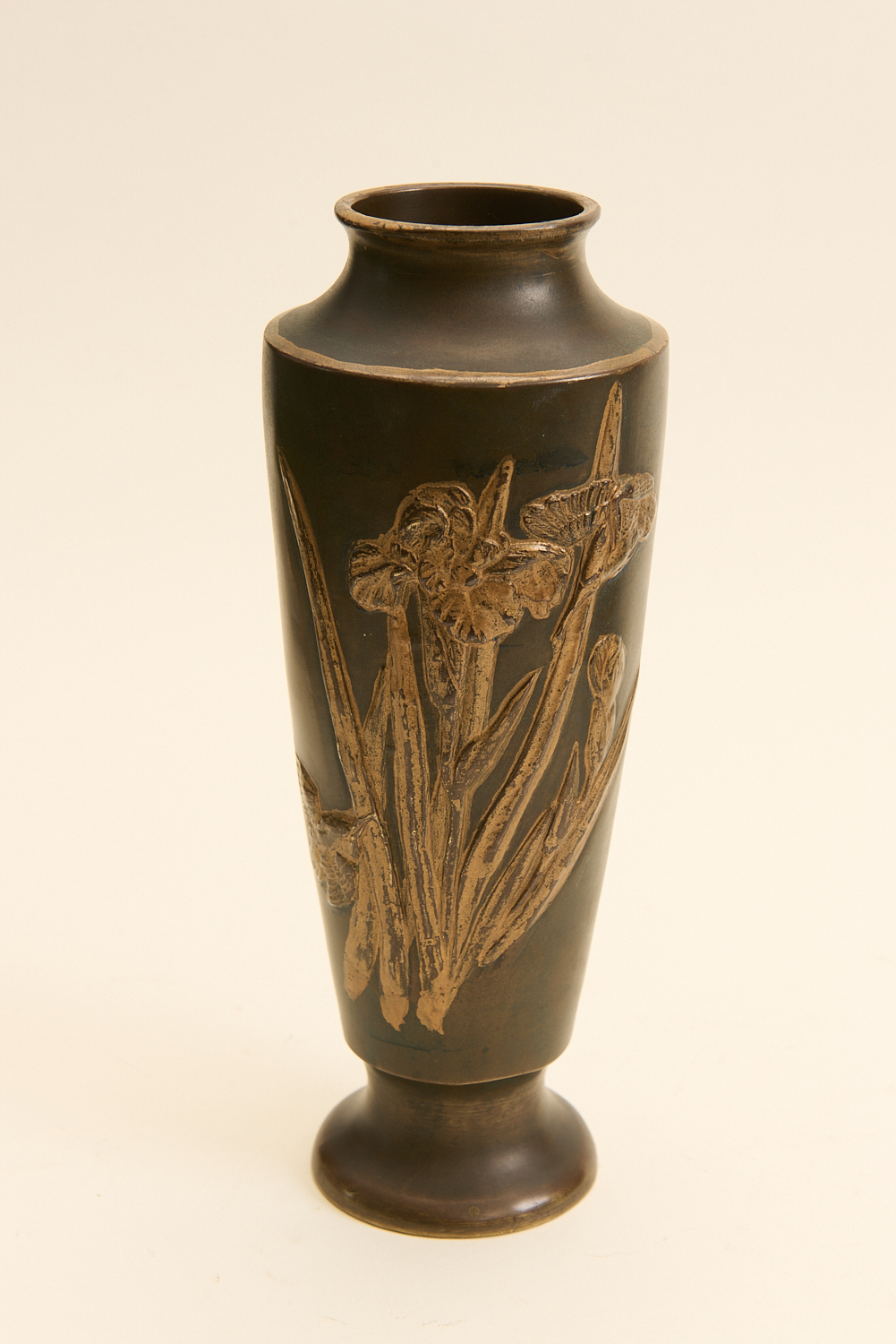 A JAPANESE BRONZE VASE WITH GILT FLOWER AND BIRD DETAILS H.28CM, LEONARD JOEL LOCAL DELIVERY SIZE: SMALL