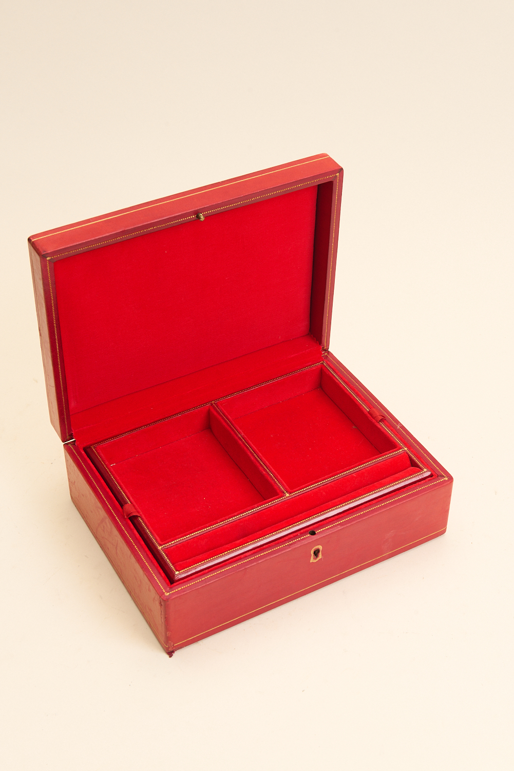 AN ITALIAN RED LEATHER JEWELLERY BOX WITH LIFT OUT INTERNAL COMPARTMENT H.8.5CM X W.24CM X D.18CM, LEONARD JOEL LOCAL DELIVERY SIZE: SMALL