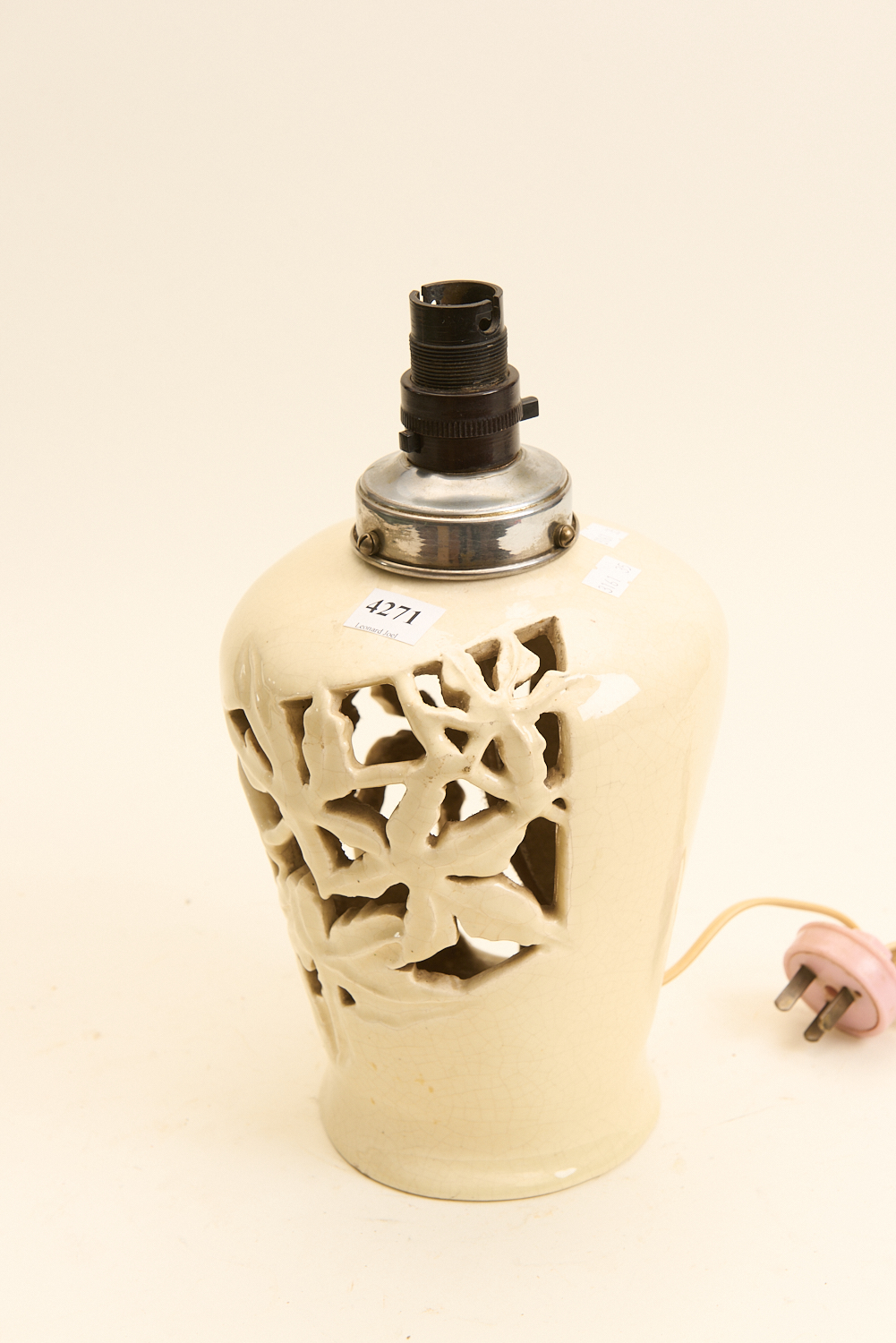 AN AUSTRALIAN POTTERY LAMP BASE WITH CUT OUT LEAF DETAIL (A/F) H.28CM, LEONARD JOEL LOCAL DELIVERY SIZE: MEDIUM