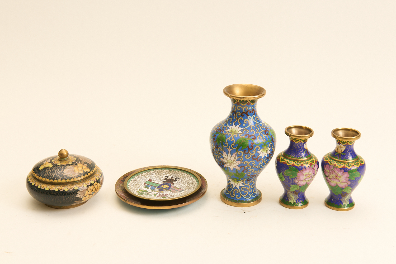 SIX VINTAGE PIECES OF CHINESE CLOISONNE INCLUDING PAIR OF VASES AND LIDDED TRINKET BOX H.16CM (LARGEST), LEONARD JOEL LOCAL DELIVERY SIZE: SMALL