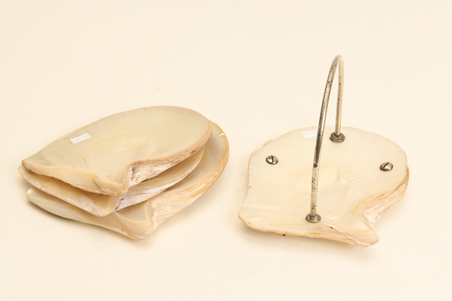 FOUR VINTAGE MOTHER OF PEARL SHELLS INCLUDING ONE WITH HANDLE (A/F) W.23CM (LARGEST), LEONARD JOEL LOCAL DELIVERY SIZE: MEDIUM