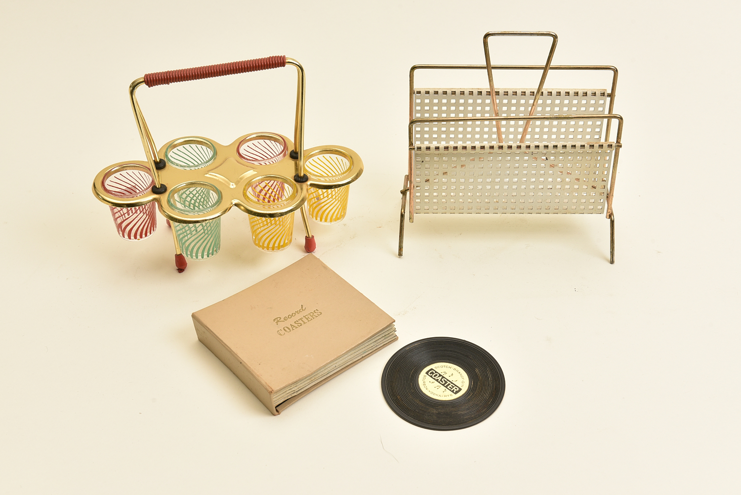 THREE MID CENTURY RETRO ITEMS INCLUDING GILT METAL DRINK CARRIER WITH GLASSES MINIATURE LETTER RACK AND SET OF SIX RECORD COASTERS (A/F), LEONARD JOEL LOCAL DELIVERY SIZE: SMALL