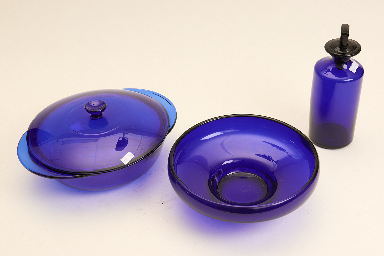 THREE PIECES OF BRISTOL BLUE GLASS KITCHENWARE INCLUDING LIDDED POT AND BOTTLE WITH STOPPER DIA,23.5CM, LEONARD JOEL LOCAL DELIVERY SIZE: MEDIUM