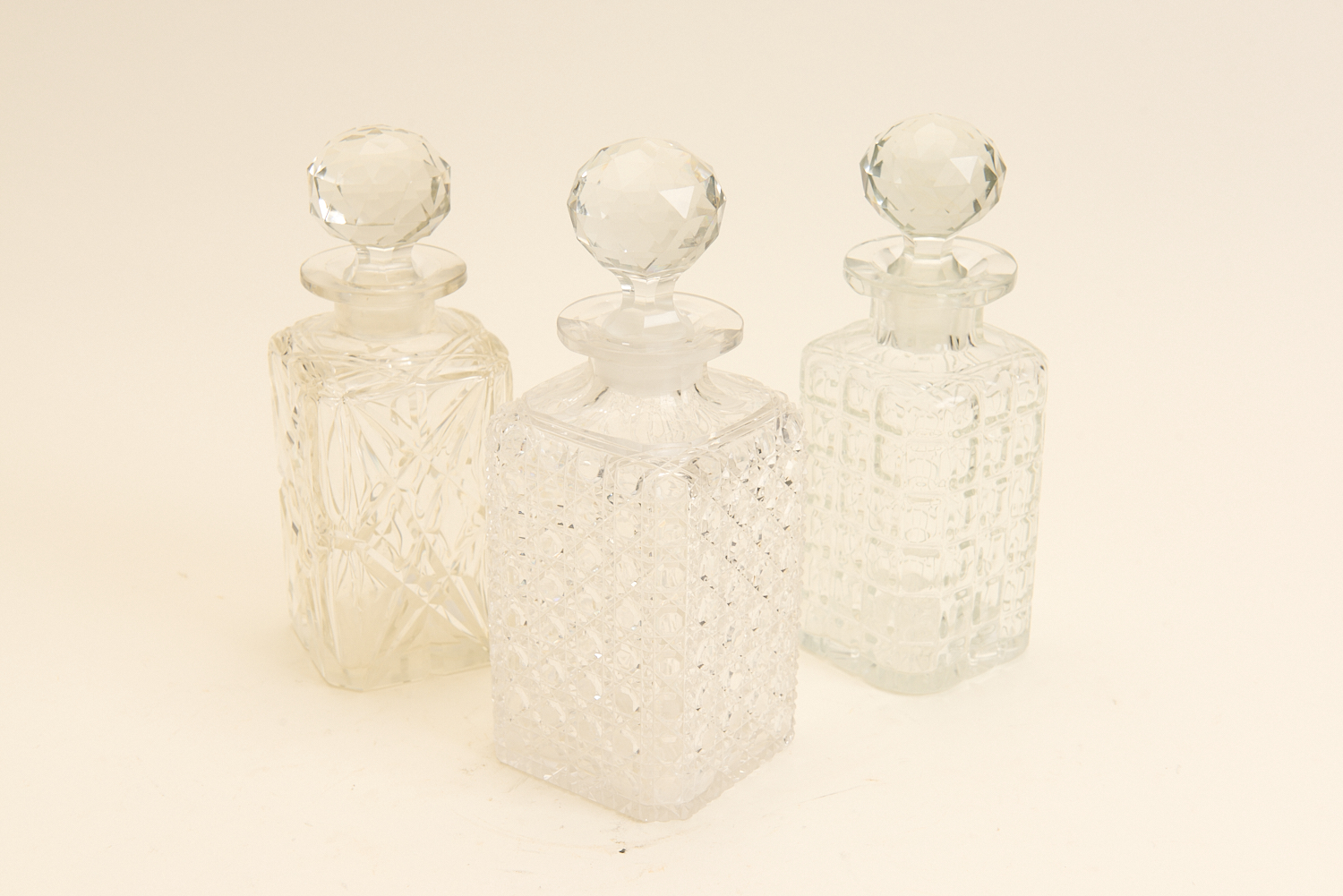 THREE CUT CRYSTAL SQUARE FORM DECANTERS H.25.5CM, LEONARD JOEL LOCAL DELIVERY SIZE: MEDIUM