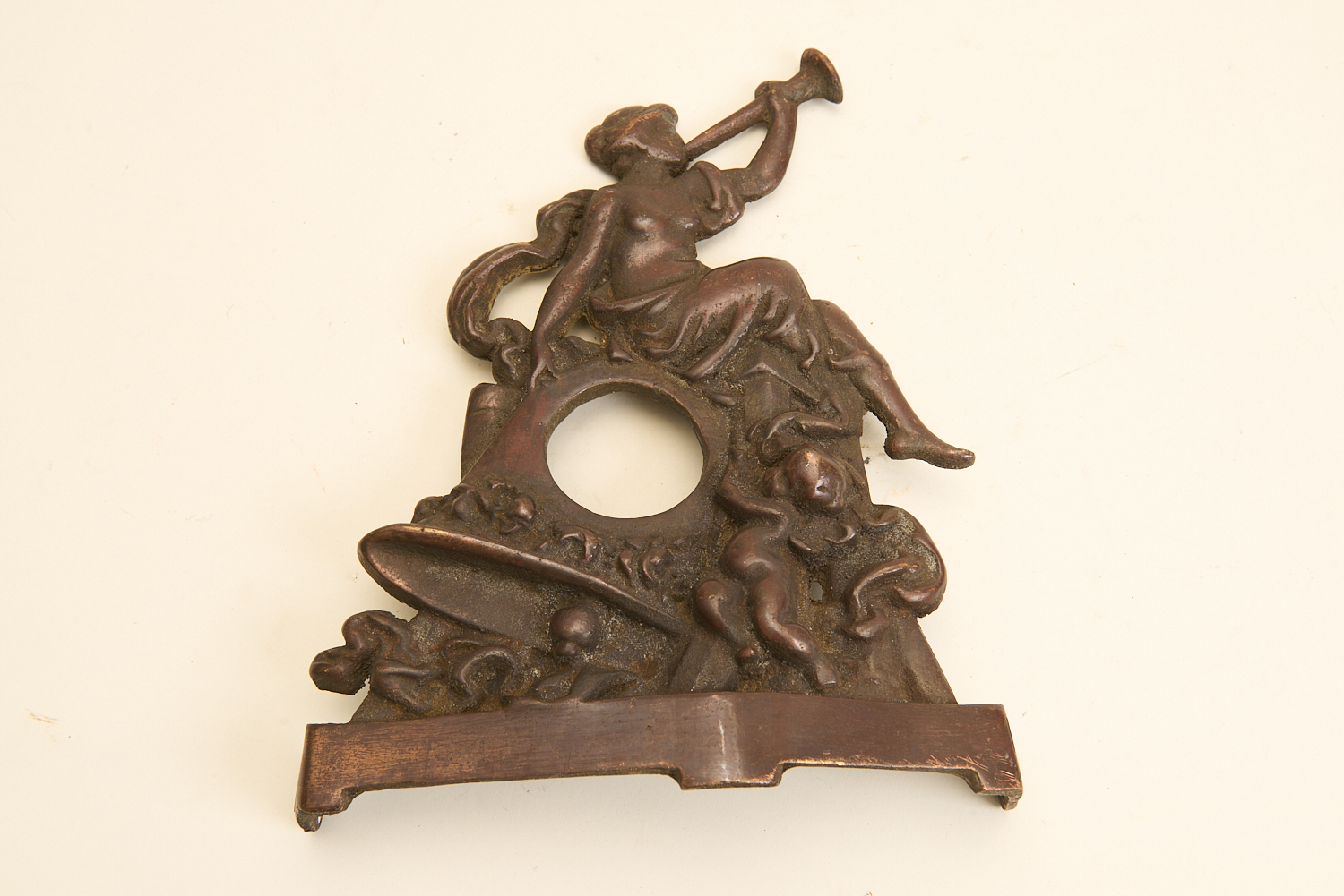 A CAST METAL MAIDEN AND CHERUB DECORATED CLOCK CASE H.30CM, LEONARD JOEL LOCAL DELIVERY SIZE: SMALL