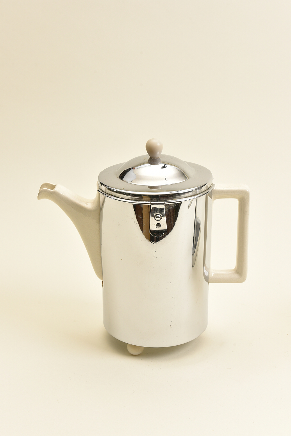 AN ART DECO HOTPOINT CERAMIC TEAPOT WITH CHROMED HEAT COVER AND WHITE BAKELITE FINIAL H.24CM, LEONARD JOEL LOCAL DELIVERY SIZE: SMALL