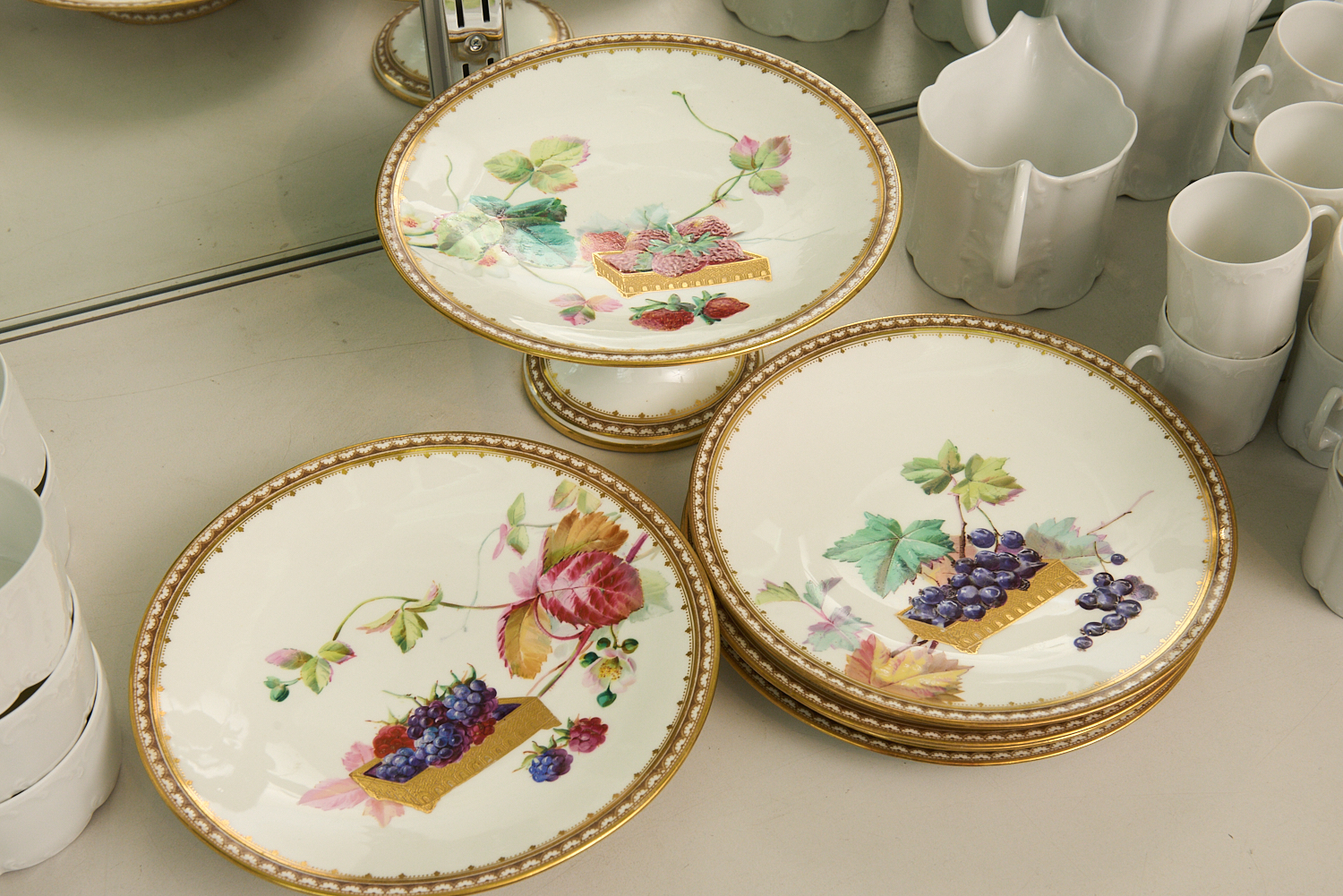 A C.1860S WILLIAM BROWNFIELD ENGLISH SIX PIECE HAND PAINTED DESSERT SERVING SET INCLUDING TWO RAISED COMPORTS AND FOUR PLATES ALL FEATURING DIFFERENT BERRIES DIA.23.5CM, LEONARD JOEL LOCAL DELIVERY SIZE: MEDIUM