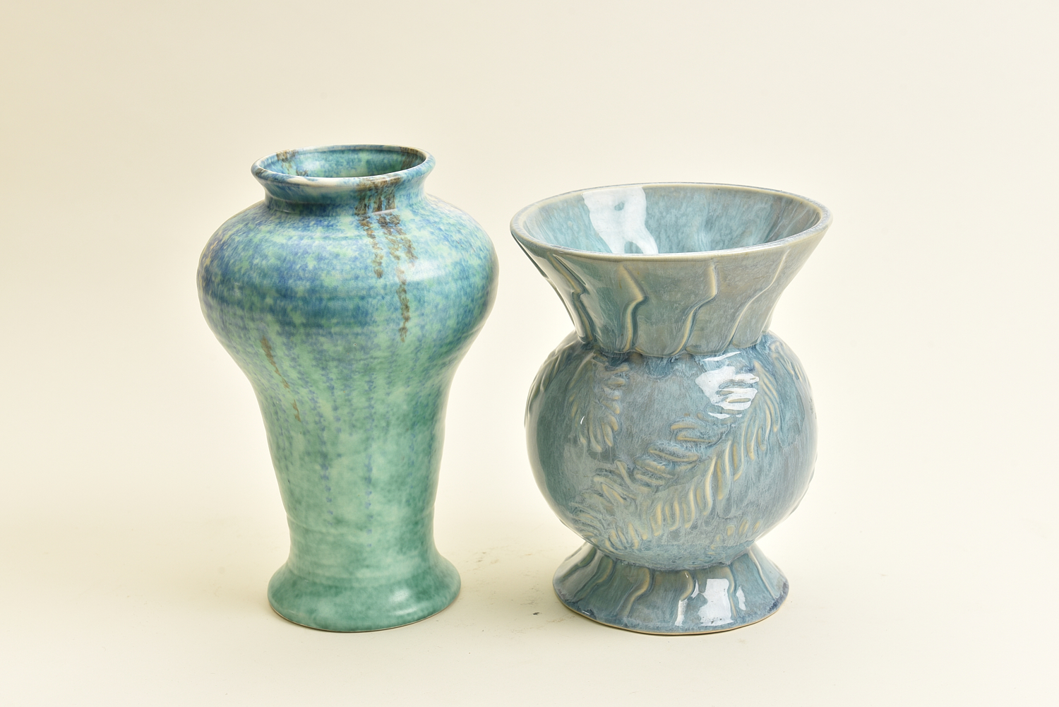 TWO ENGLISH ART DECO POTTERY VASES INCLUDING BESWICK AND ANOTHER SIGNED ILLEGIBLY H.27CM (TALLEST), LEONARD JOEL LOCAL DELIVERY SIZE: SMALL