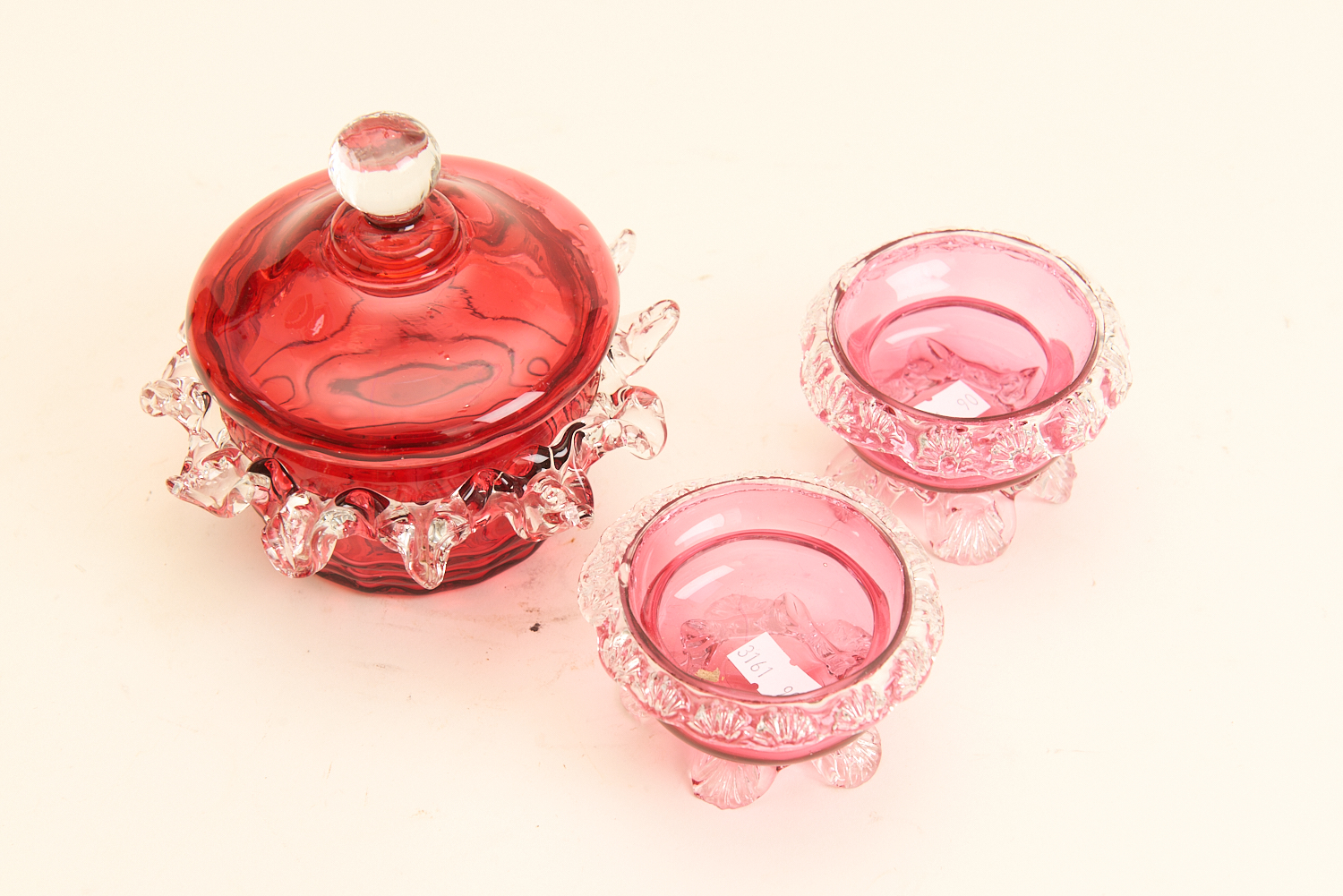 THREE RUBY GLASS ITEMS INCLUDING PAIR OF OPEN SALTS ON FEET AND LIDDED TRINKET BOX DIA.15CM, LEONARD JOEL LOCAL DELIVERY SIZE: SMALL