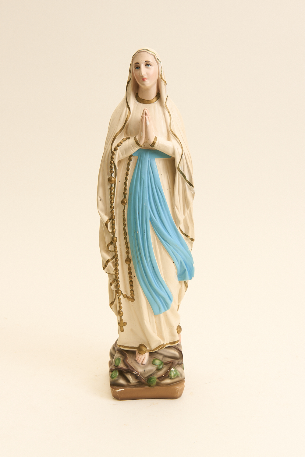 A PAINTED CHALKWARE FIGURE OF MARY STAMPED TO BASE C.M H.41CM, LEONARD JOEL LOCAL DELIVERY SIZE: SMALL