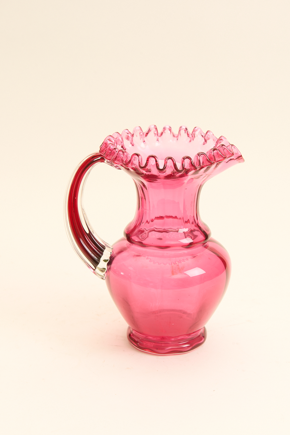 A VICTORIAN RUBY GLASS FRILL EDGED JUG WITH HANDLE H.20CM, LEONARD JOEL LOCAL DELIVERY SIZE: SMALL