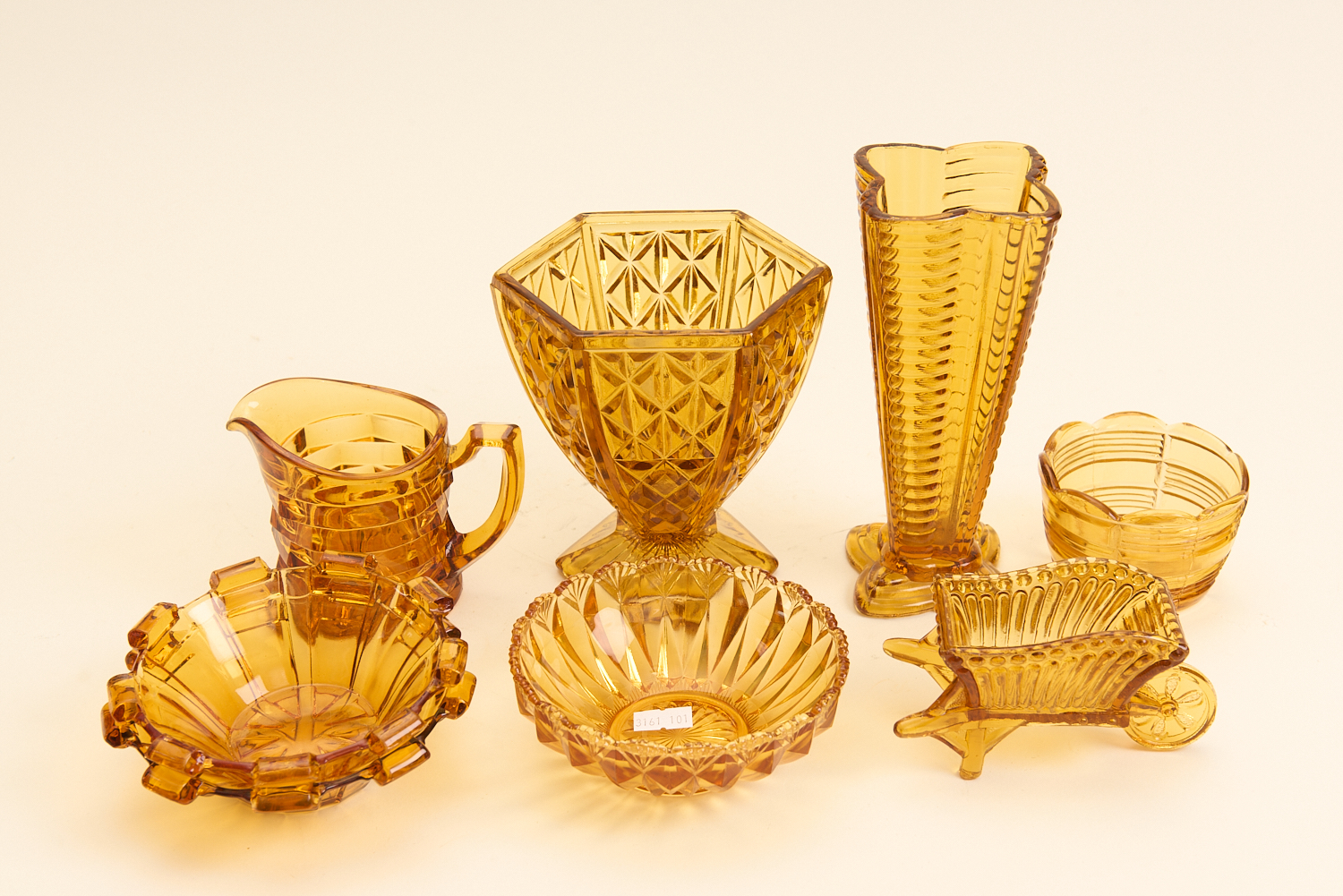A COLLECTION OF 1940S ENGLISH PRESSED AMBER GLASS, LEONARD JOEL LOCAL DELIVERY SIZE: MEDIUM