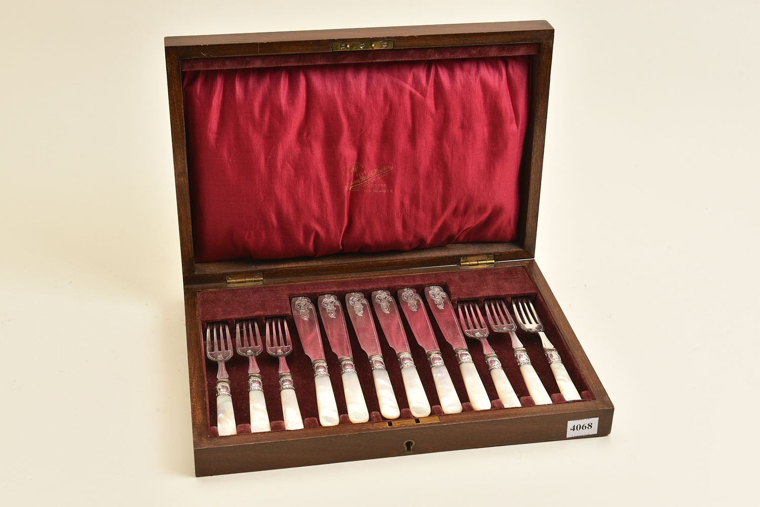 A WALNUT CASED SET OF SIX MOTHER OF PEARL HANDLED FISH KNIVES AND FORKS WITH STERLING SILVER FERRULES, LEONARD JOEL LOCAL DELIVERY SIZE: MEDIUM