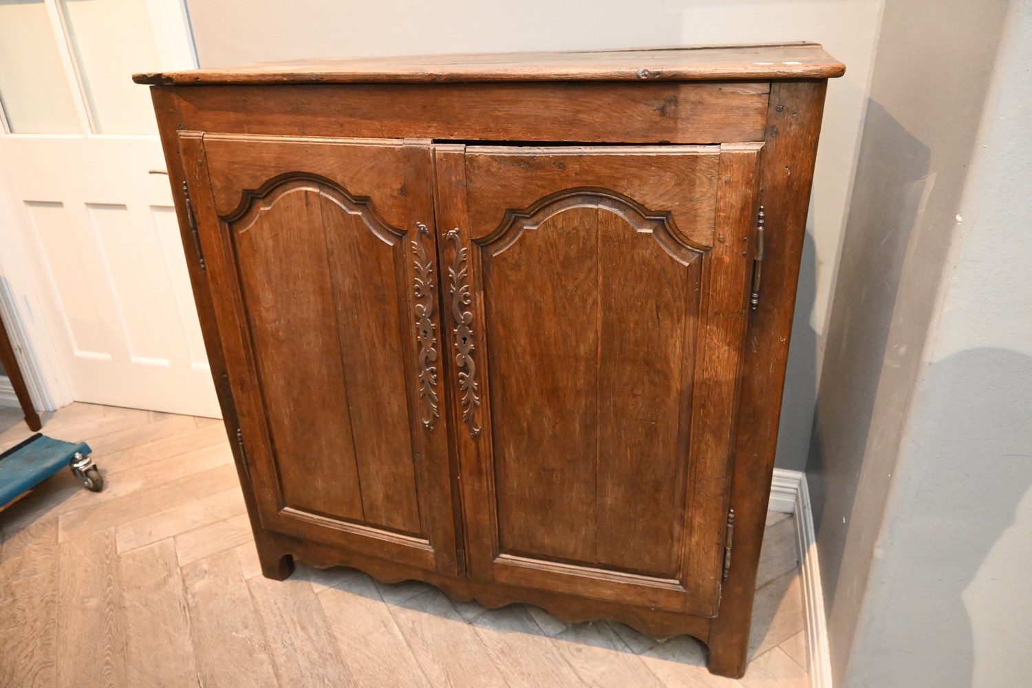 AN EARLY 18TH CENTURY FRENCH OAK THREE QUARTER CABINET FROM BURGUNDY, CIRCA 1720 (WITH KEY) (A/F) (130H X 133W X 63D CM) (PLEASE NOTE THIS HEAVY ITEM MUST BE REMOVED BY CARRIERS AT THE CUSTOMER'S EXPENSE. LEONARD JOEL STAFF CANNOT ASSIST CARRYING THIS ITEM) (X-LARGE ITEM)