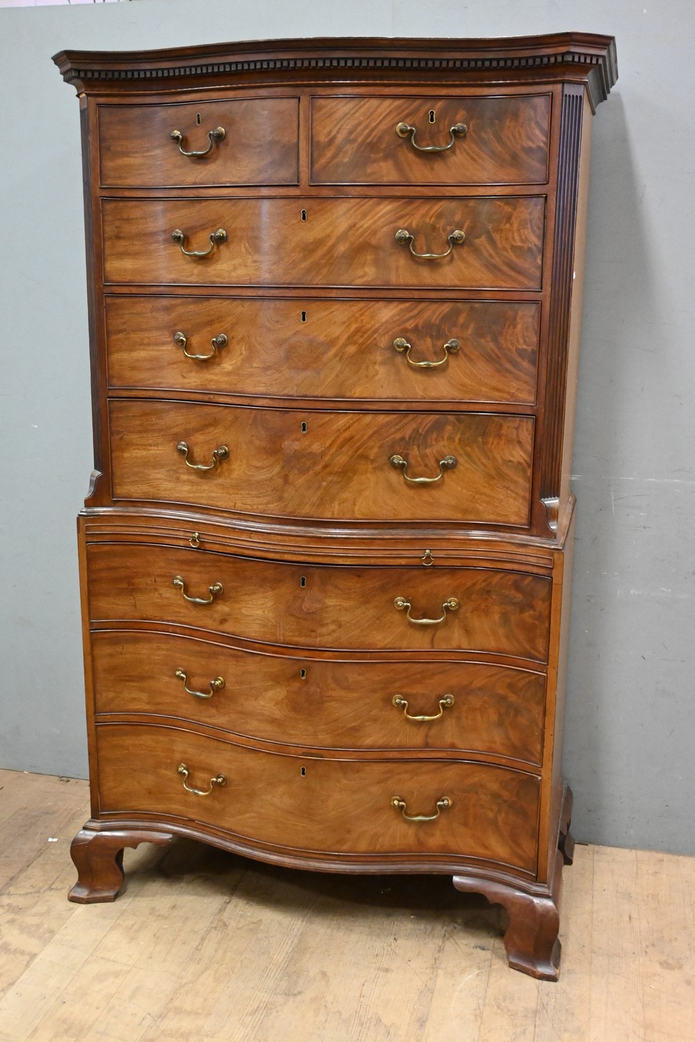 A SUBSTANTIAL SERPENTINE BURR WALNUT CHEST ON CHEST WITH BRASS HANDLES (A/F) (188H X 113W X 53D CM) (PLEASE NOTE THIS HEAVY ITEM MUST BE REMOVED BY CARRIERS AT THE CUSTOMER'S EXPENSE. LEONARD JOEL STAFF CANNOT ASSIST CARRYING THIS ITEM) (X-LARGE ITEM)