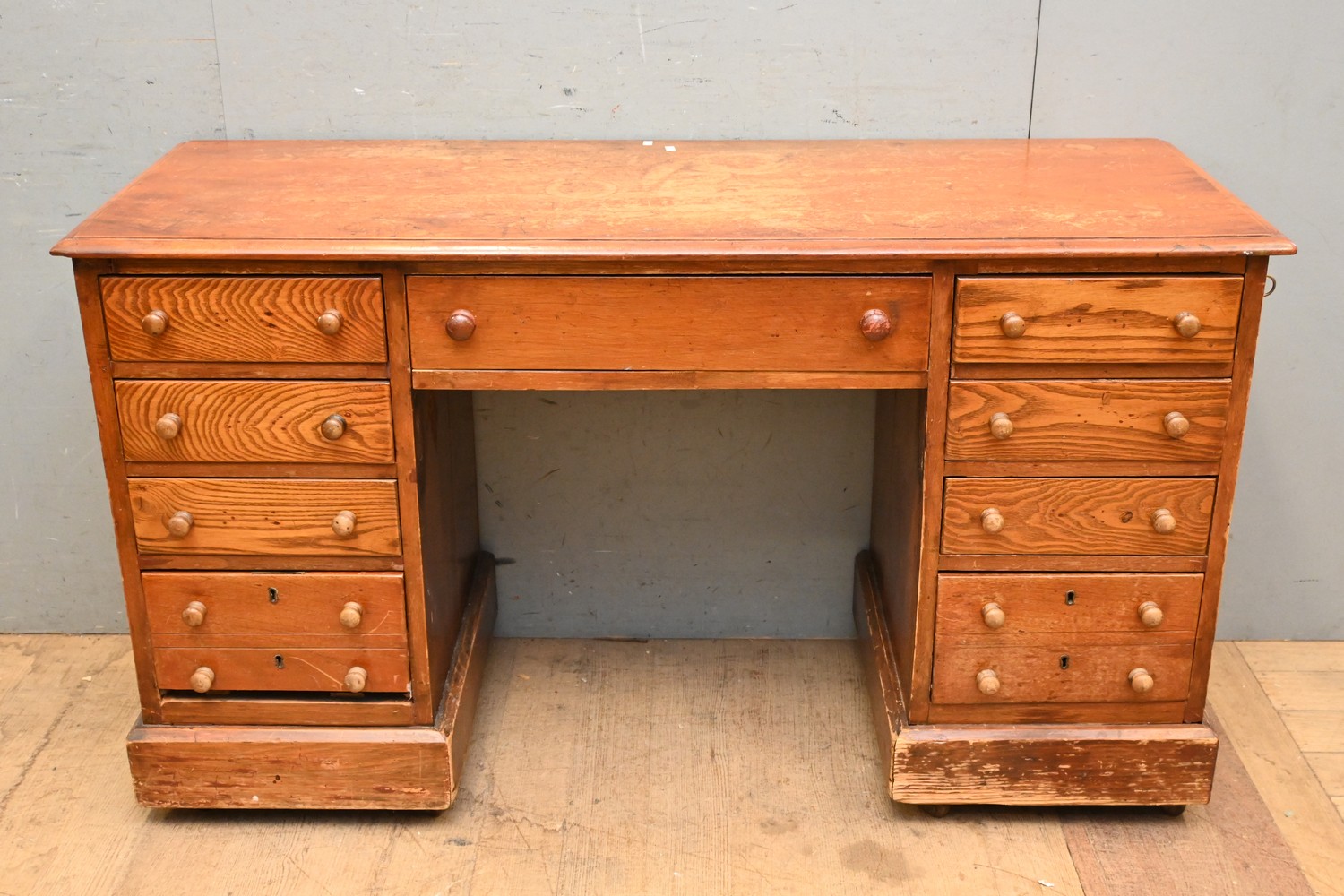 AN OAK NINE DRAWER PEDASTAL DESK (A/F) (79H X 137W X 50D CM) (PLEASE NOTE THIS HEAVY ITEM MUST BE REMOVED BY CARRIERS AT THE CUSTOMER'S EXPENSE. LEONARD JOEL STAFF CANNOT ASSIST CARRYING THIS ITEM) (X-LARGE ITEM)