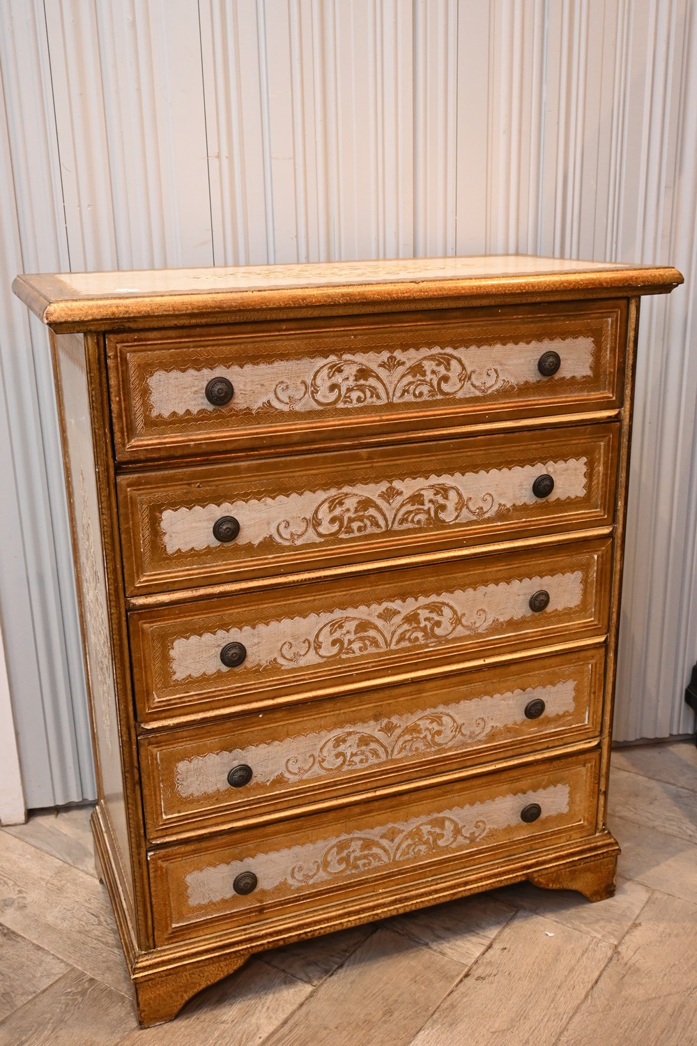 A GILTWOOD FIVE DRAWER CHEST OF DRAWERS (A/F) (91H X 78W X 38D CM) (LEONARD JOEL DELIVERY SIZE: LARGE)