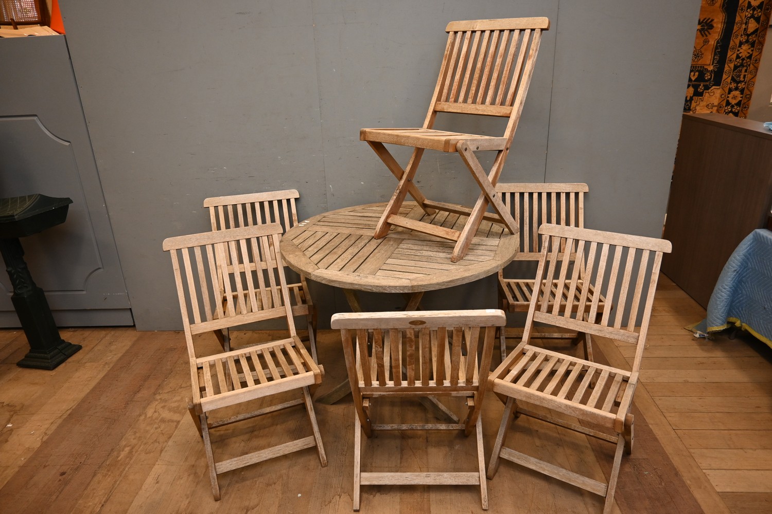 A SEVEN PIECE FOLDING TEAK SETTING (75H X 100 DIAMETER) (PLEASE NOTE THIS HEAVY ITEM MUST BE REMOVED BY CARRIERS AT THE CUSTOMER'S EXPENSE. LEONARD JOEL STAFF CANNOT ASSIST CARRYING THIS ITEM) (X-LARGE ITEM)