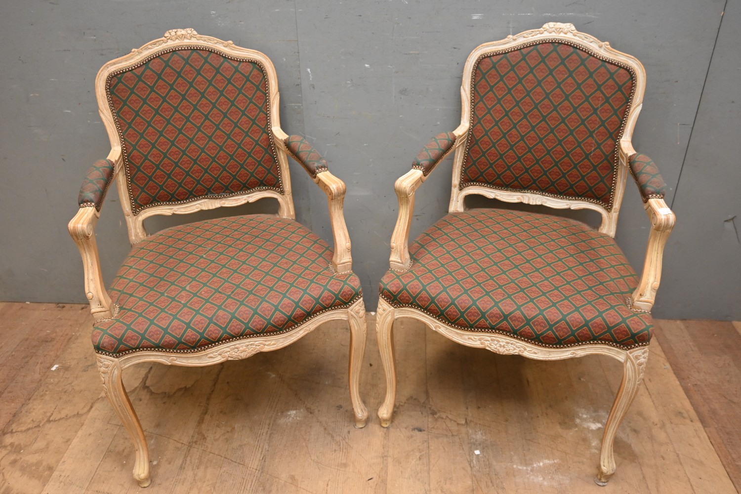A PAIR OF LOUIS XV STYLE ARMCHAIRS (A/F) (98H X 63W X 59D CM) (LEONARD JOEL DELIVERY SIZE: LARGE)