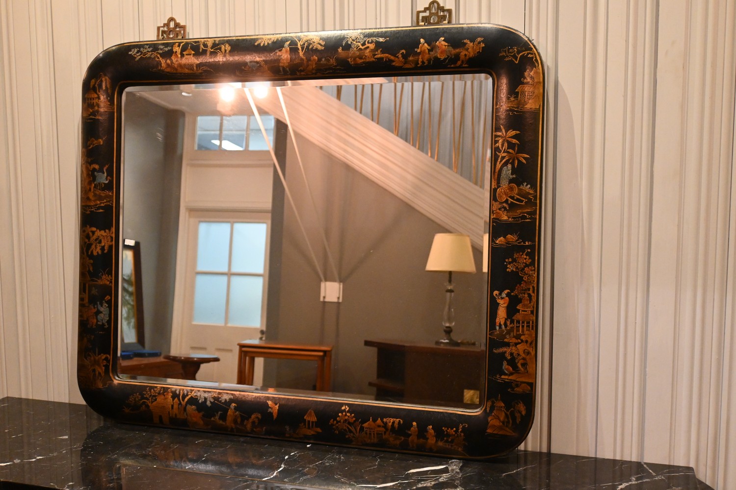 A CHINOISERIE STYLE EBONISED WALL MIRROR (88H X 107W CM) (LEONARD JOEL DELIVERY SIZE: LARGE)