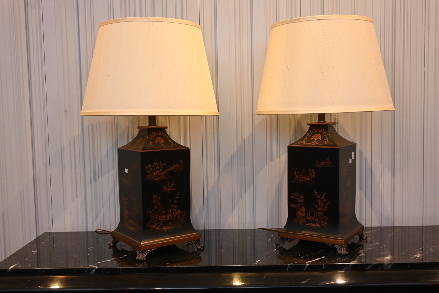 A PAIR OF CHINOISERIE STYLE TABLE LAMPS WITH HAND PAINTED DETAILING (75H X 46D CM) (LEONARD JOEL DELIVERY SIZE: LARGE)