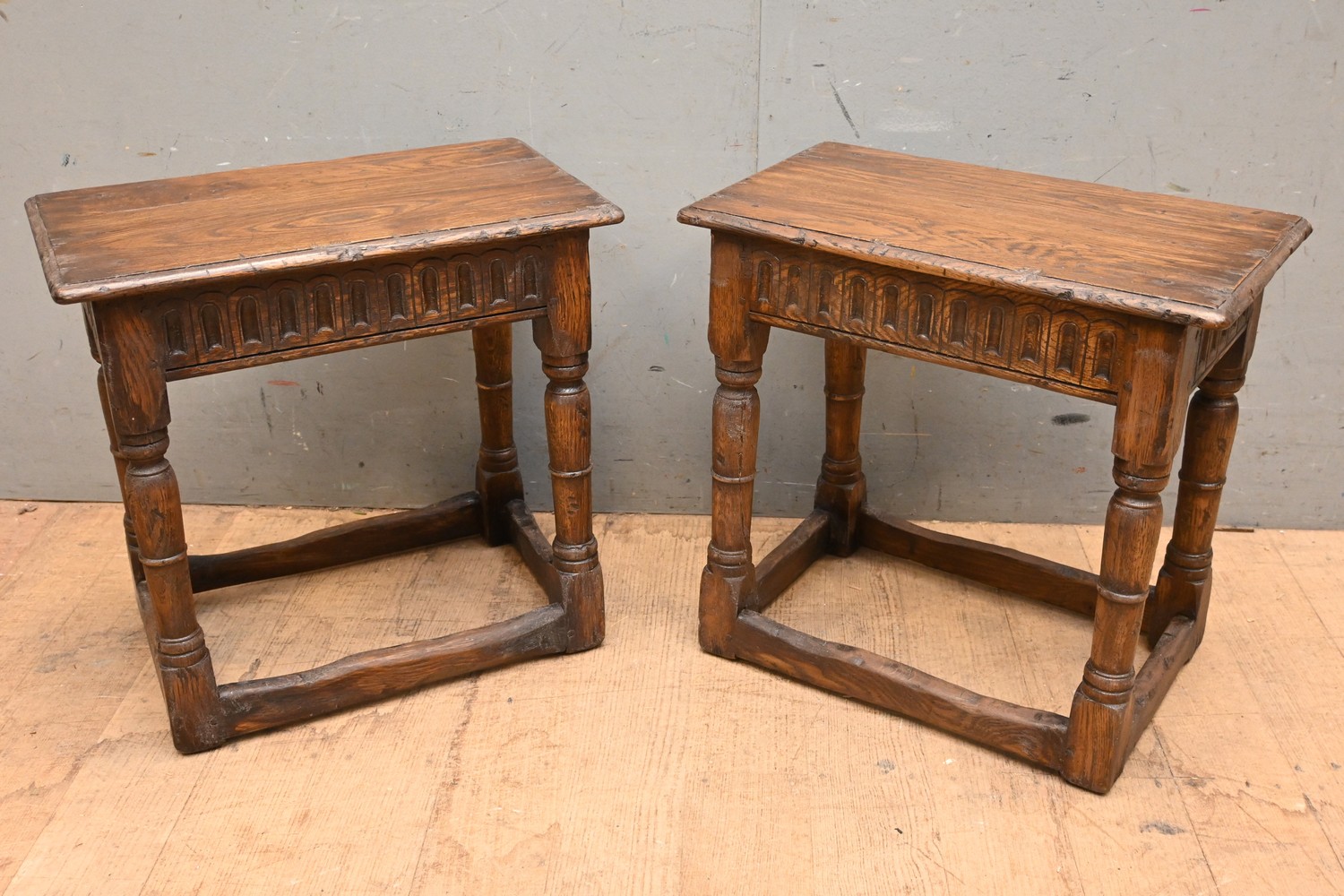 A PAIR OF OAK 17TH CENTURY STYLE JOINT STOOLS (45H X 48W X 28D CM) (LEONARD JOEL DELIVERY SIZE: LARGE)