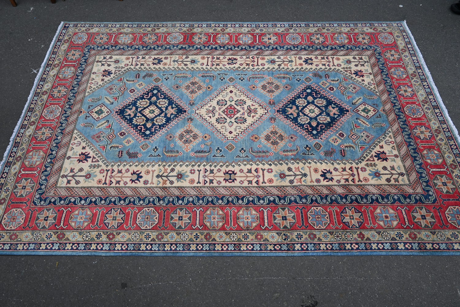 A HANDMADE KAZAK RUG WITH VEGETABLE DYES, HANDSPUN WOOL, ALL HAND KNOTTED (298 X 196 CM) (LEONARD JOEL DELIVERY SIZE: LARGE)