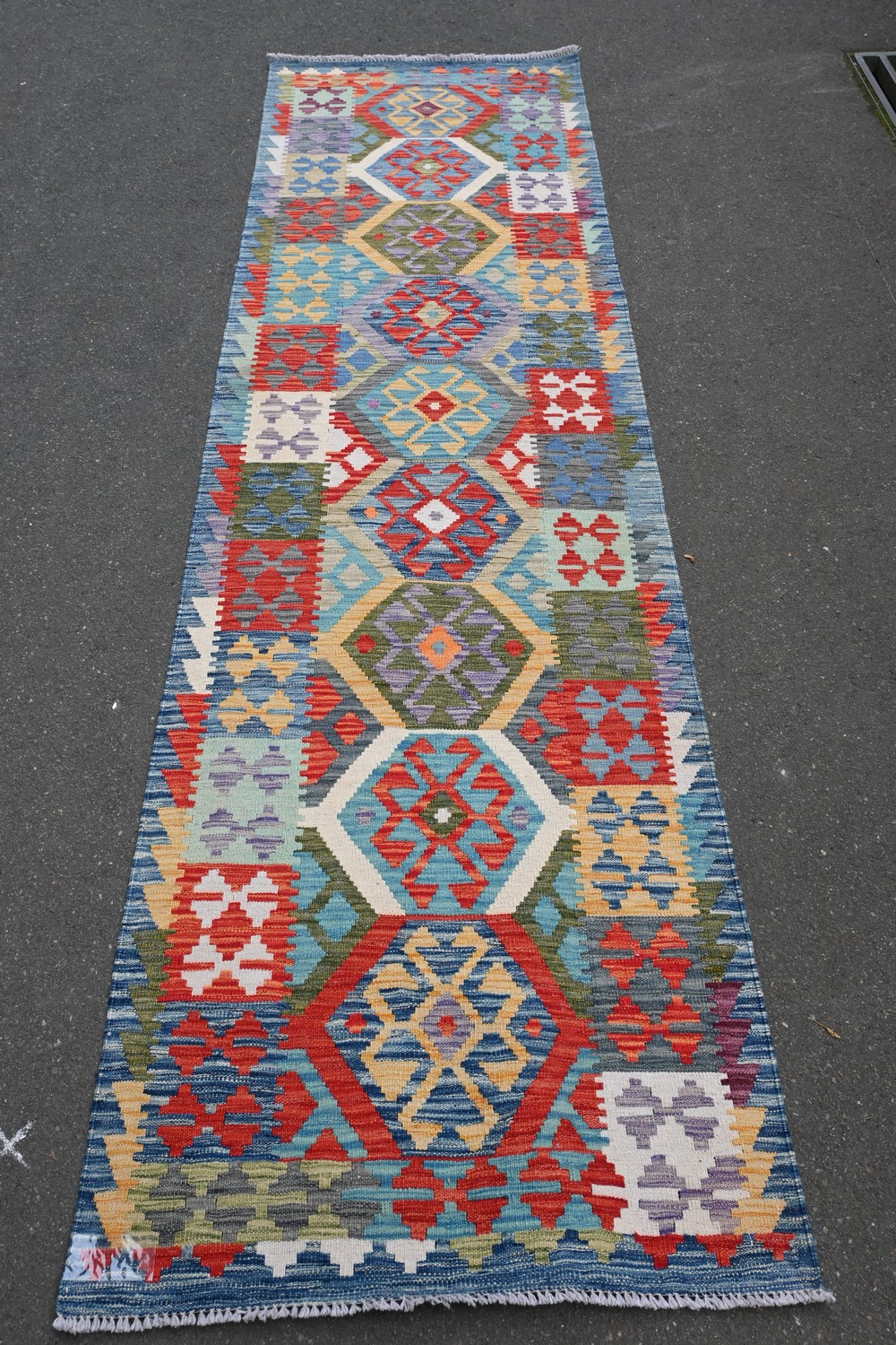 A HANDMADE AFGHAN KAZAK KILIM RUNNER WITH NATURAL VEGETABLE DYES (310 X 82 CM) (LEONARD JOEL DELIVERY SIZE: LARGE)