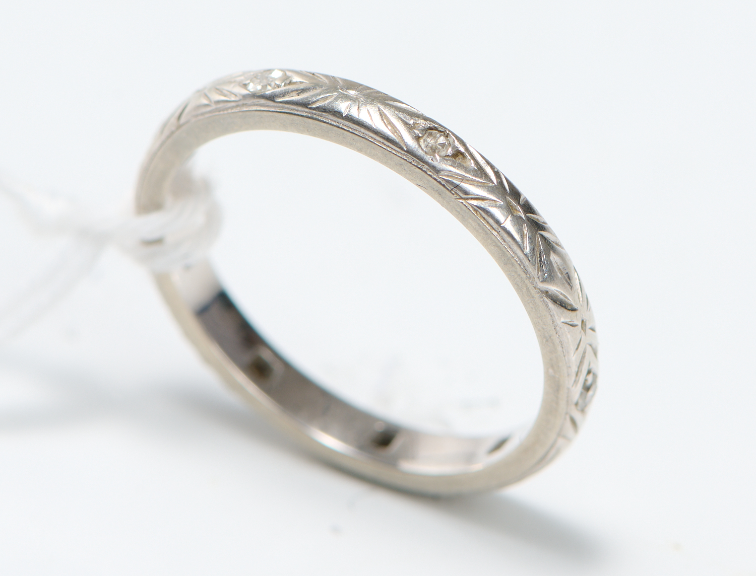 A DIAMOND SET BAND IN 18CT WHITE GOLD, RING SIZE O, 3.6GMS