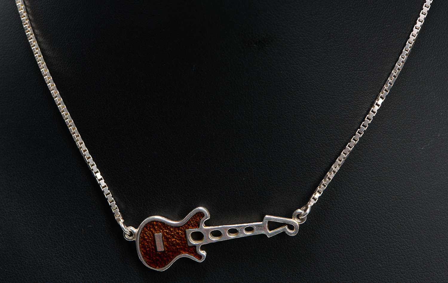 AN ITALIAN STERLING SILVER AND ENAMEL GUITAR PENDANT NECKLACE, LENGTH APPROXIAMTELY 390MM