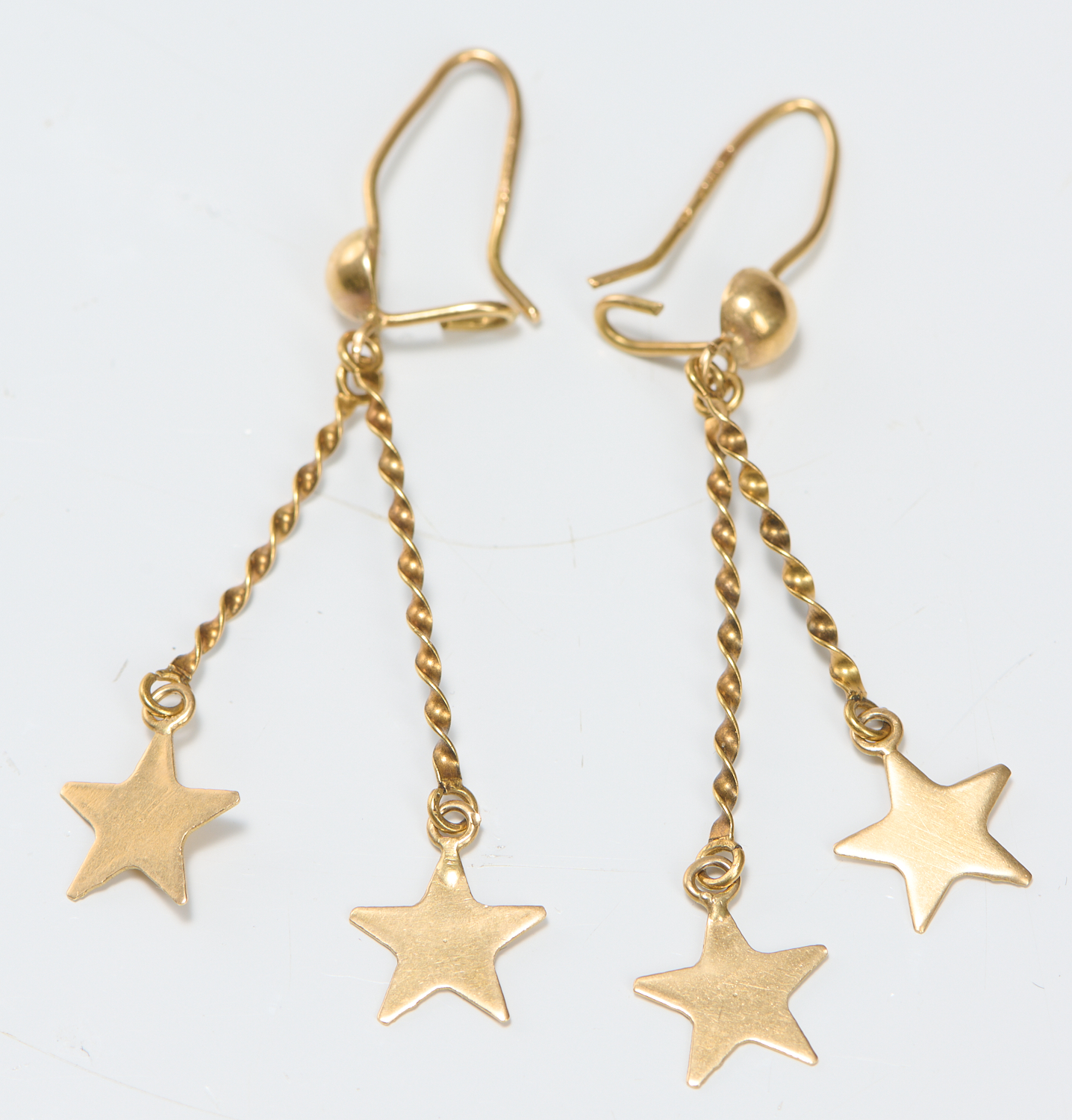 A PAIR OF START EARRINGS IN 18CT GOLD, TO SHEPHERDS HOOK FITTINGS, DROP LENGTH APPROXIMATELY 41MM, 2.3GMS