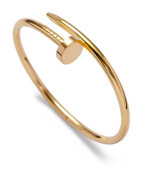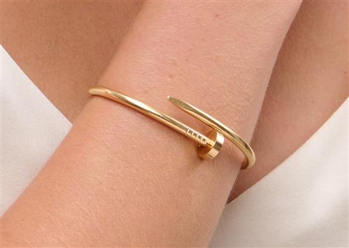 The 3.50mm round wire hinged oval cuff is modelled as an asymmetrical nail, gross weight 33.09 grams, inner circumference 160mm, inner diameter 63mm, size 17, numbered CBA436, signed Cartier.