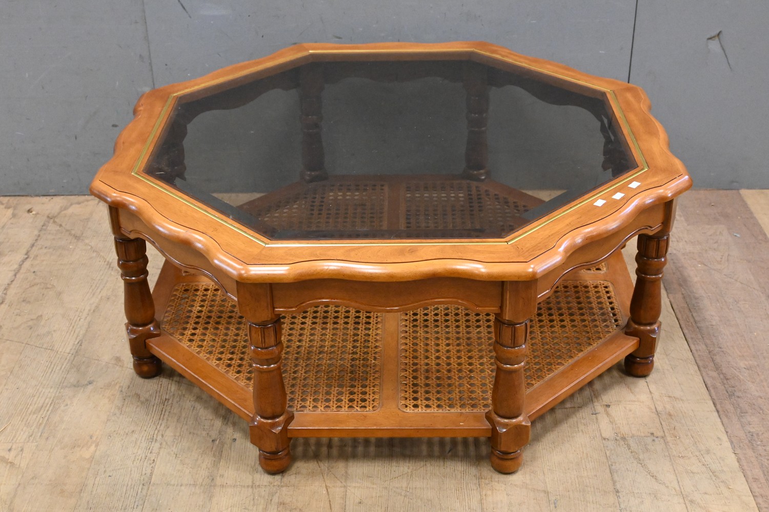 AN OCTAGONAL GLASS INSET COFFEE TABLE WITH RATTAN BASE (42H X 100 DIAMETER) (LEONARD JOEL DELIVERY SIZE: LARGE)