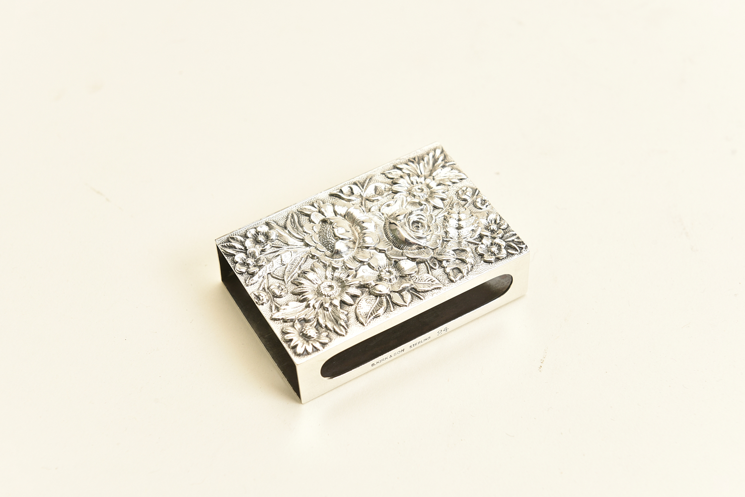 A STERLING SILVER FLORAL REPOUSSE MATCH BOX COVER H.5.7CM, LEONARD JOEL LOCAL DELIVERY SIZE: SMALL