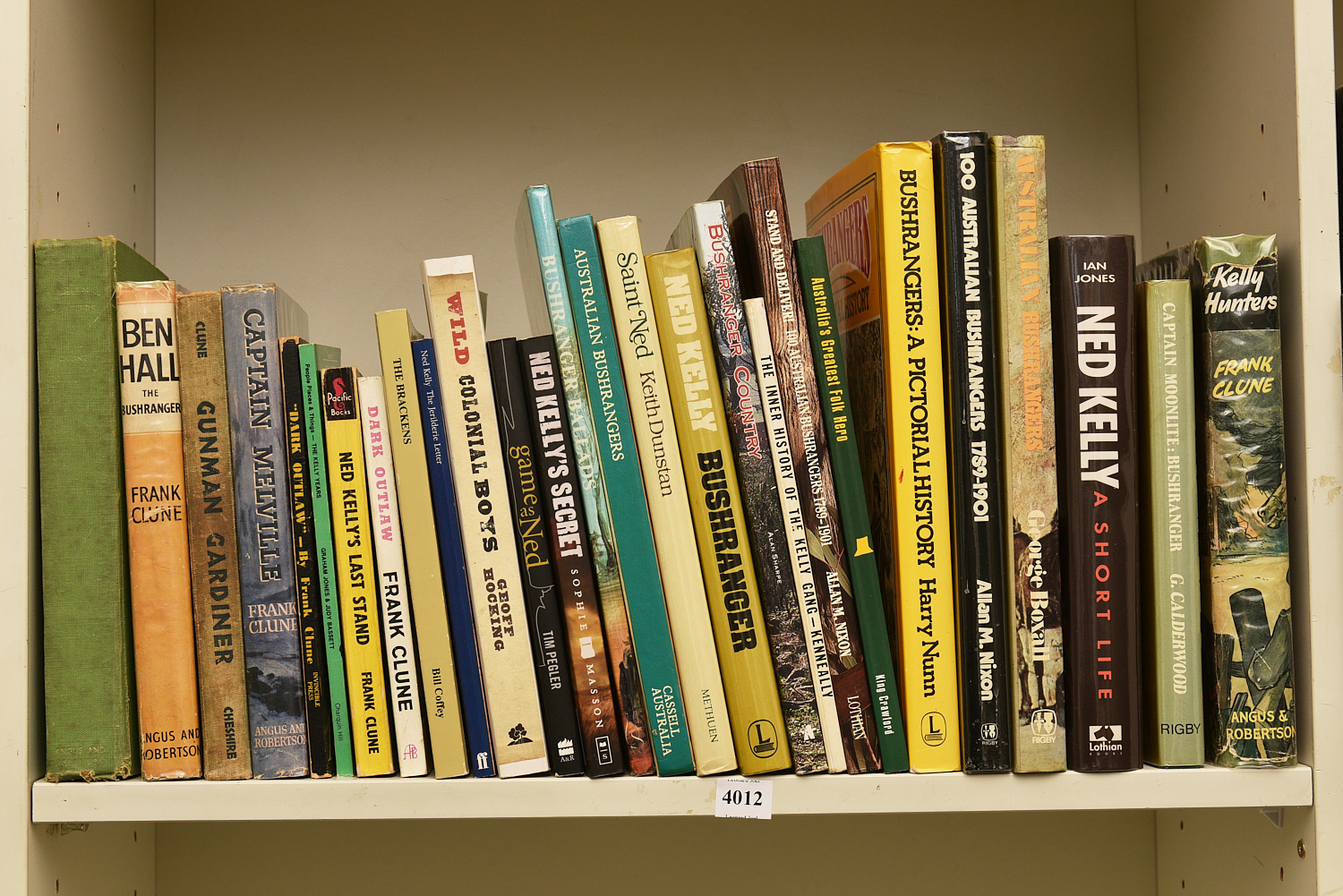 A SHELF OF BOOKS PERTAINING TO NED KELLY AND AUSTRALIAN BUSH RANGERS, LEONARD JOEL LOCAL DELIVERY SIZE: MEDIUM